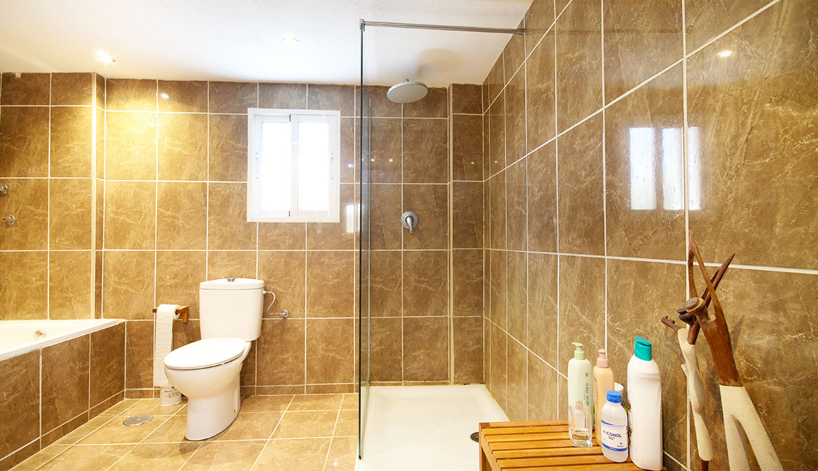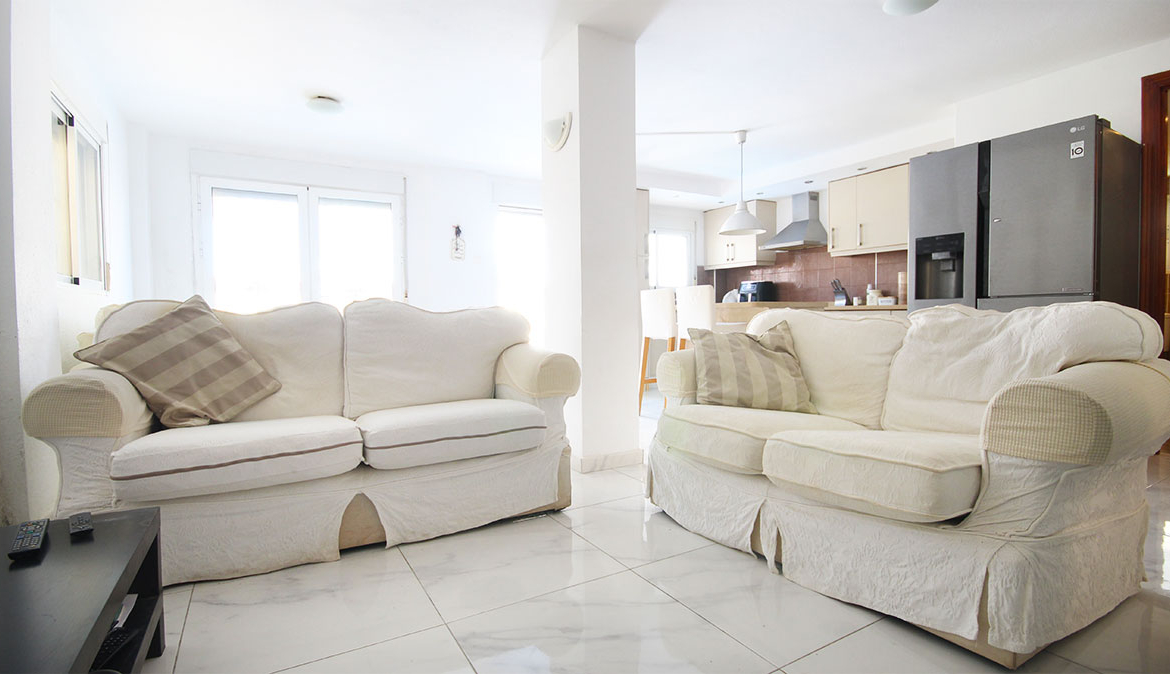 Also on the ground floor are the open plan kitchen, a wc and a bedroom with A/C and fitted wardrobe.