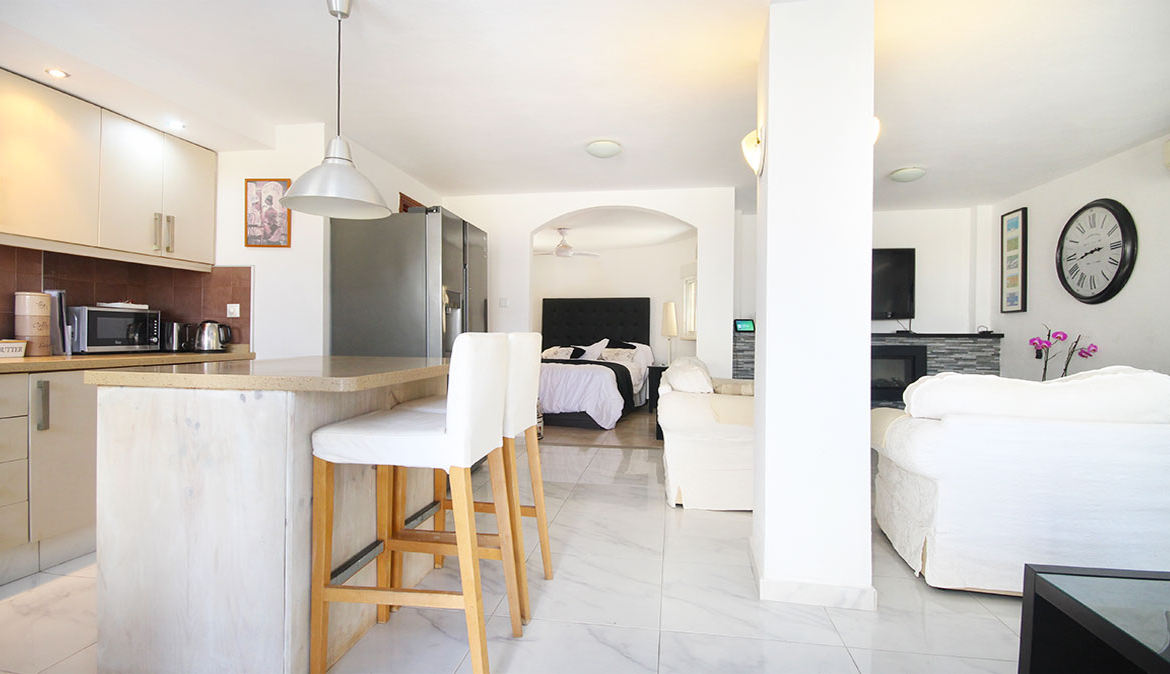 The apartment itself is bright and open plan. The kitchen area has an island with seating. The lounge is inviting with large white sofas and the bedroom to the back is through an arch. There is a large bathroom with bath, wc and walking shower.